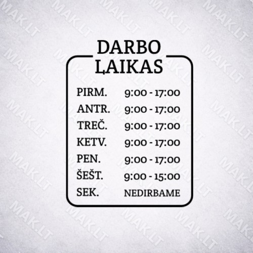 Darbo laiko lipdukas – tai paprastas ir estetiškas būdas informuoti klientus apie jūsų įmonės darbo laiką. Lipdukas skirtas klijuoti ant parduotuvių, biurų, grožio salonų, kavinių ar kitų paslaugų vietų durų bei vitrinų. Aiškiai pateiktas darbo laikas ant durų leidžia klientams greitai sužinoti, kada įmonė dirba.