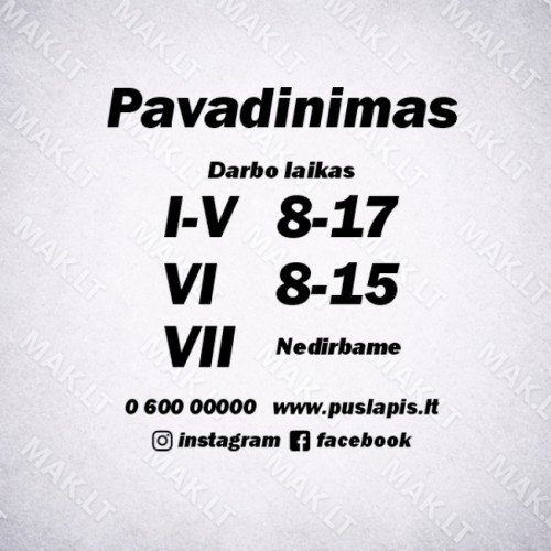 Darbo laiko lipdukas – tai paprastas ir estetiškas būdas informuoti klientus apie jūsų įmonės darbo laiką. Lipdukas skirtas klijuoti ant parduotuvių, biurų, grožio salonų, kavinių ar kitų paslaugų vietų durų bei vitrinų. Aiškiai pateiktas darbo laikas ant durų leidžia klientams greitai sužinoti, kada įmonė dirba.