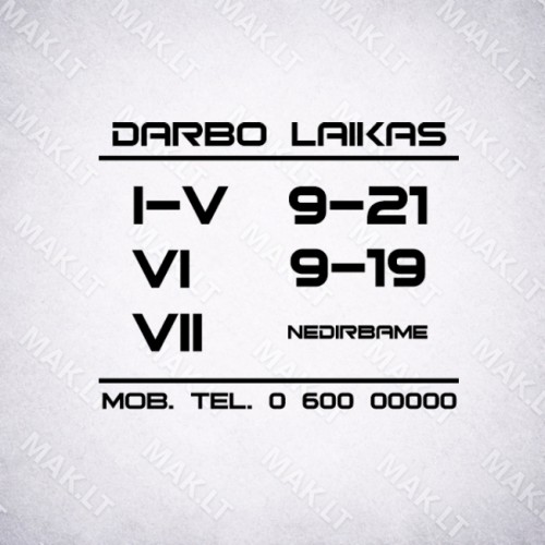 Darbo laiko lipdukas – tai paprastas ir estetiškas būdas informuoti klientus apie jūsų įmonės darbo laiką. Lipdukas skirtas klijuoti ant parduotuvių, biurų, grožio salonų, kavinių ar kitų paslaugų vietų durų bei vitrinų. Aiškiai pateiktas darbo laikas ant durų leidžia klientams greitai sužinoti, kada įmonė dirba.