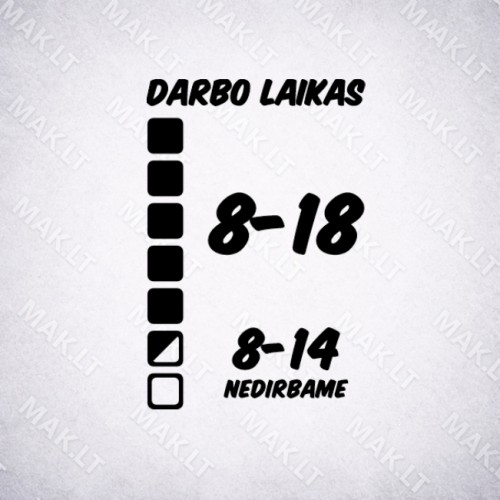 Darbo laiko lipdukas – tai paprastas ir estetiškas būdas informuoti klientus apie jūsų įmonės darbo laiką. Lipdukas skirtas klijuoti ant parduotuvių, biurų, grožio salonų, kavinių ar kitų paslaugų vietų durų bei vitrinų. Aiškiai pateiktas darbo laikas ant durų leidžia klientams greitai sužinoti, kada įmonė dirba.