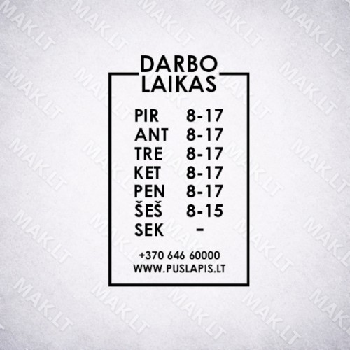 Darbo laiko lipdukas – tai paprastas ir estetiškas būdas informuoti klientus apie jūsų įmonės darbo laiką. Lipdukas skirtas klijuoti ant parduotuvių, biurų, grožio salonų, kavinių ar kitų paslaugų vietų durų bei vitrinų. Aiškiai pateiktas darbo laikas ant durų leidžia klientams greitai sužinoti, kada įmonė dirba.