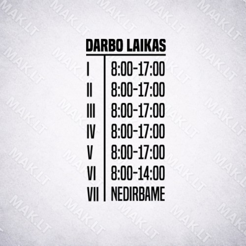 Darbo laiko lipdukas – tai paprastas ir estetiškas būdas informuoti klientus apie jūsų įmonės darbo laiką. Lipdukas skirtas klijuoti ant parduotuvių, biurų, grožio salonų, kavinių ar kitų paslaugų vietų durų bei vitrinų. Aiškiai pateiktas darbo laikas ant durų leidžia klientams greitai sužinoti, kada įmonė dirba.
